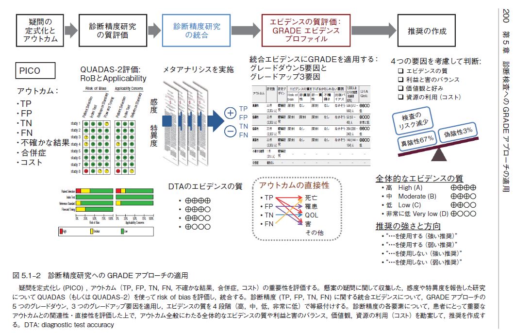 ”診断精度研究に関するGRACE Evidence to Decision” GRADE 2版の第5章、診断検査へのGRADEアプローチの適用 詳細は、GRADE2版の第5章、および、追加資料-12「診断精度研究のメタアナリシス」を参照。 |
